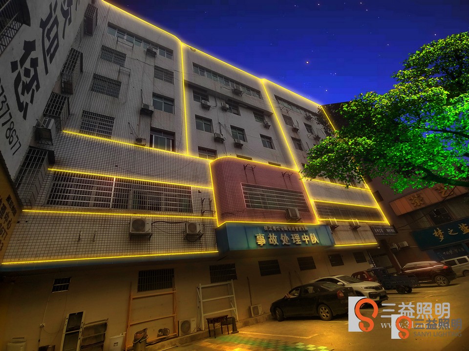 桃江縣公安交警大隊、事故入處理中心外墻燈光設(shè)計方案,采用線條燈勾勒大樓輪廓。